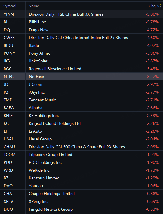 Bilibili, YINN fell 6%; Baidu fell 4%; Alibaba, JD.com fell 3%; Li Auto, PDD fell 2%.