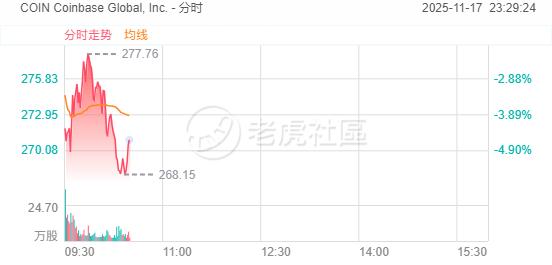 11月17日,美股加密货币概念股盘中下挫,Coinbase、Upexi跌超5%,BitMine、Bakkt、Robinhood 、Circle跌超4%。