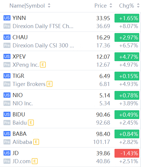 Hot Chinese ADRs and ETFs jump in premarket trading. YINN gains 8%; CHAU rises 6.6%; XPeng rises about 5%; NIO rises nearly 4%; Alibaba is up 2.8%.