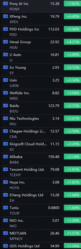 China ADRs Jump; Pony AI up 8%; Xpeng and PDD up 6%; Hesai and Li Auto up 4%; WeRide and Baidu up 3%; Alibaba up 2%.