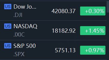 The S&P 500 rose 55.19 points, or 0.97%, to 5,751.13 points, while the Nasdaq Composite climbed 259.01 points, or 1.45%, to 18,182.92. The Dow Jones Industrial Average gained 126.13 points, or 0.30%, to 42,080.37.