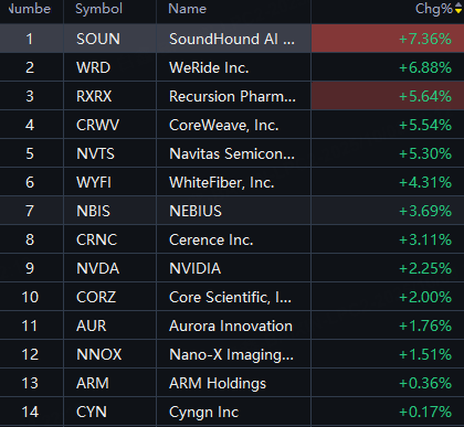 Nvidia Concept Stocks Jumped; SoundHound and WeRide up 7%; Navitas, Recursion and CoreWeave up 5%; WhiteFiber up 4%; Nebius and Cerence up 3%.