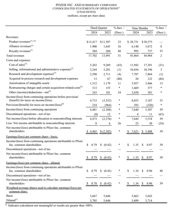 10月29日,辉瑞发布2024年第三季度业绩。财报显示,第三季度营收177.02亿美元,市场预期149.5亿美元,去年同期132.3亿美元;净利润44.8亿美元,市场预期16.9亿美元,去年同期净亏损23.8亿美元;每股收益0.79美元,市场预期0.29美元,去年同期每股亏损0.42美元。