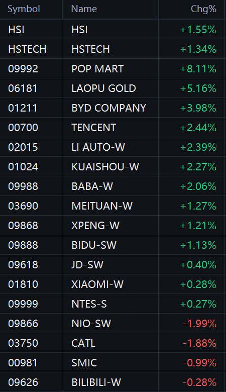In terms of star stocks, Pop Mart rose 8%; Laopu Gold rose 5%; BYD rose 4%; Tencent, Li Auto, Kuaishou, and Alibaba rose 2%; Meituan, XPeng, and Baidu rose 1%; JD.com rose 0.8%; Xiaomi and NetEase rose 0.3%; NIO and CATL fell 2%; SMIC fell 1%.