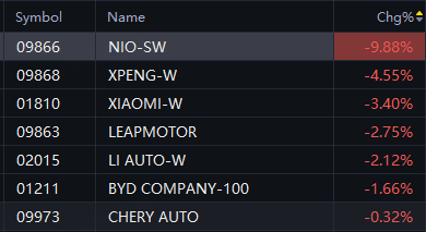EV stocks sank in Hong Kong. NIO fell 10%; XPeng fell 5%; Xiaomi, Leapmotor fell 3%; Li Auto, BYD fell 2%.