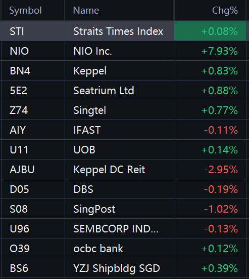 Singapore stocks opened higher on Friday. STI rose 0.1%; NIO rose 8%; Seatrium rose 0.9%; Keppel and Singtel rose 0.8%; Keppel DC Reit fell 3%; OCBC edged higher after earnings.