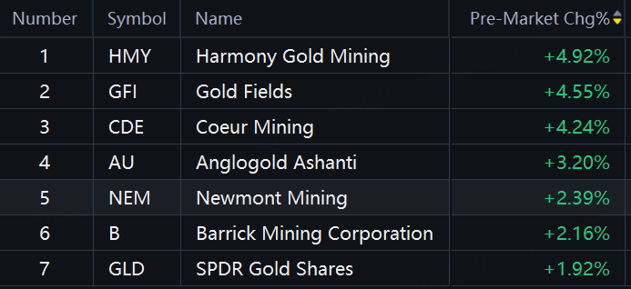 U.S.-listed gold shares jumped on Tuesday as spot gold extended gains to $4,200 per ounce for the first time. Harmony Gold up 5%; Gold Fields, Coeur Mining up over 4%; Anglogold up 3%; GLD, Newmont Mining, Barrick Mining up around 2%.