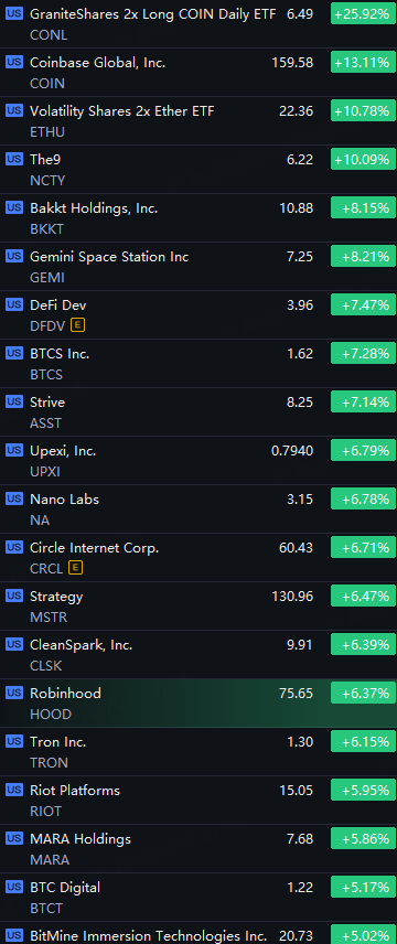 Crypto Stocks Rally. CONL up 26%; Coinbase up 13%; ETHU and The9 up 10%; Bakkt and Gemini up 8%; Circle, Strategy, Robinhood and MARA up 6%.