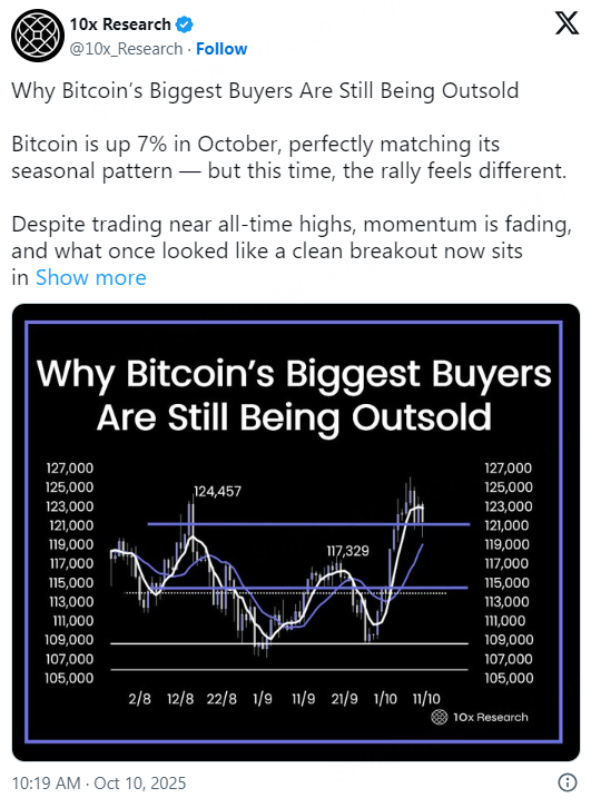 Bitcoin is up 7% in October, in line with its seasonal trend, but this rally feels markedly different. Institutional whales continue to accumulate aggressively, yet early adopters are quietly selling into strength, dampening momentum.