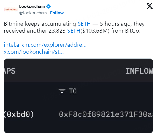 Blockchain data shows that BitMine Immersion Technologies has reportedly acquired 23,823 ETH, worth around $103.7 million, into its corporate treasury, according to Lookonchain citing Arkham data. The transfer originated from a BitGo wallet linked to the address “0xF8c…338E7.” BitMine has yet to confirm the purchase.