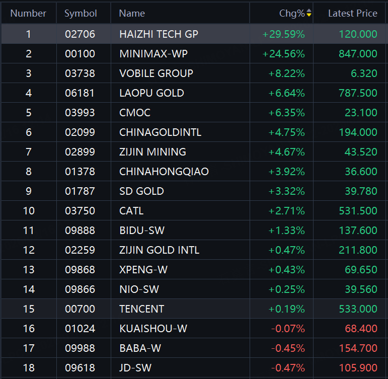 Haizhi Tech up nearly 30%; Vobile Group up over 8%; Laopu Gold, CMOC up over 6%; China Gold Intl, Zijin Mining up nearly 5%.