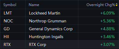 Lockheed Martin stock rose 6%; Northrop Grumman, General Dynamics jumped 5%; RTX Corporation, Huntington Ingalls up 3%. The overnight rally came after these stocks plunged during the regular session when Trump threatened to prohibit dividends and stock buybacks for defense companies.