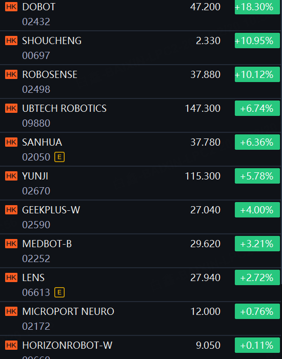 HK Robotics Stocks Jump. Dobot up 18%; Shoucheng and Robosense up 10%; Ubtech, Yunji and Sanhua up 6%; Geekplus Up 4%.