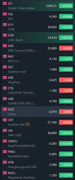 Singapore stocks opened higher on Monday. STI rose 0.3%, SIA rose 0.5%, UOB rose 0.2%, Nio rose 1.5%, Oxley fell 3.9%, MPACT rose 2.3%.
