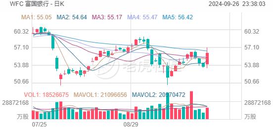 本周四(9月26日), 富国银行 一度涨超5%,截至发稿报56.1美元,涨幅4.64%,创今年2月以来最大单日涨幅: