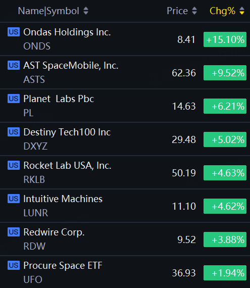 Aerospace stocks jumped on Thursday. Ondas Holdings up 15%; AST SpaceMobile up over 9%; Planet Labs up 6%; Destiny Tech100 up 5%; Rocket Lab up over 4%.