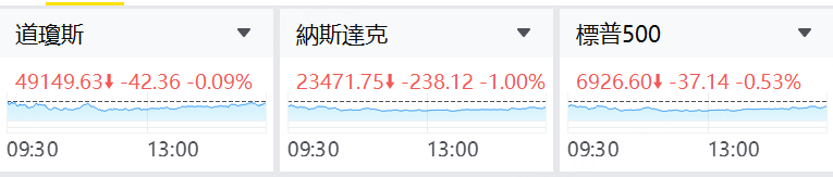 美东时间周三,美股三大指数集体收跌,其中纳斯达克指数跌幅居前。截至收盘,道指跌42.36点,跌幅为0.09%,报49149.63点;纳指跌238.12点,跌幅为1.00%,报23471.75点;标普500指数跌36.75点,跌幅为0.53%,报6926.99点。