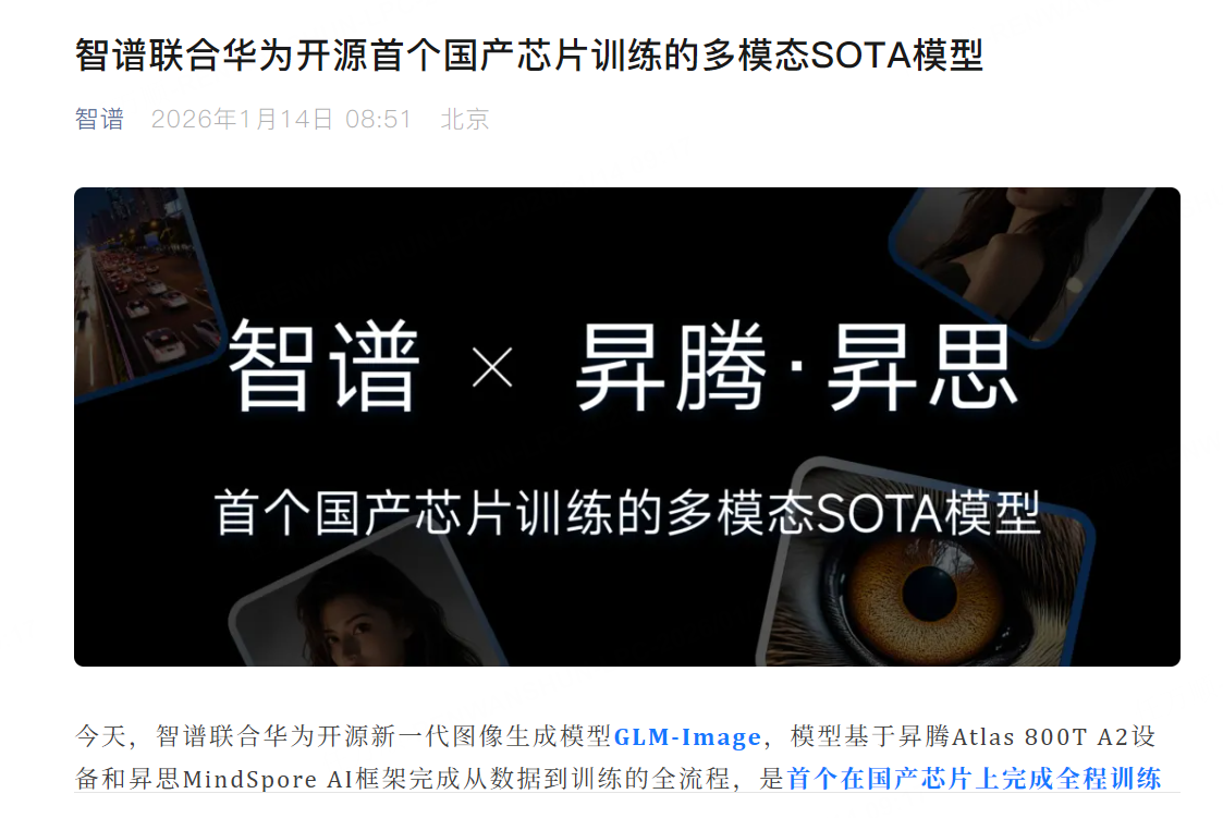 智谱今天宣布联合华为开源新一代图像生成模型GLM-Image,模型基于昇腾Atlas 800T A2设备和昇思MindSpore AI框架完成从数据到训练的全流程,是首个在国产芯片上完成全程训练的SOTA多模态模型。