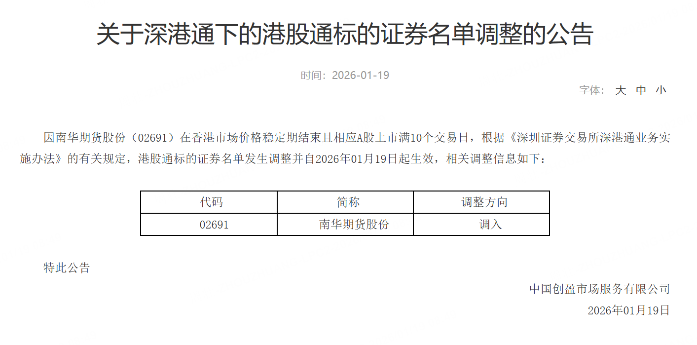 1月19日,深交所:港股通标的证券名单调整,调入南华期货股份,1月19日起生效。