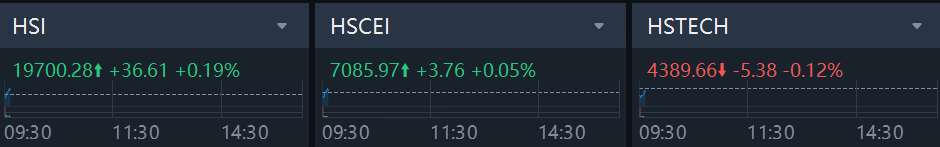 Hong Kong stock market opened with mixed results. The Hang Seng Index (HSI) rose 0.19%, the Hang Seng China Enterprises Index (HSCEI) rose 0.05%, the Hang Seng Tech Index (HSTECH) dropped by 0.12%, and the Hang Seng China-Affiliated Corporations Index (HSCCI) slightly declined by 0.02%.