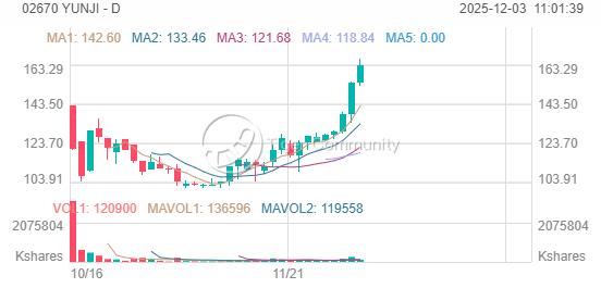YUNJI (02670) surged over 7%, reaching a new all-time high of HK$166.4 since its listing, marking a nearly 75% increase from its offer price. As of press time, the stock rose 6.23% to HK$163.7, with a turnover of HK$17.6963 million.