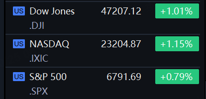 The Dow Jones Industrial Average rose 472.51 points, or 1.01%, to 47,207.12, the S&P 500 gained 53.25 points, or 0.79%, to 6,791.69 and the Nasdaq Composite gained 263.07 points, or 1.15%, to 23,204.87.