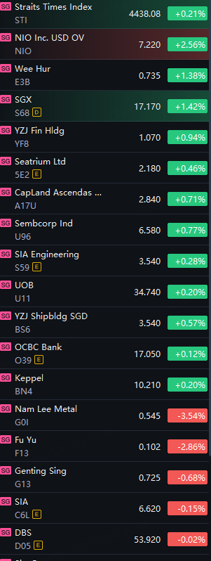 Singapore stocks opened higher on Monday. STI rose 0.2%; Nio up 3%; Wee Hur, SGX and YZJ Fin up 1%; Nam Lee and Fu Yu down 3%.