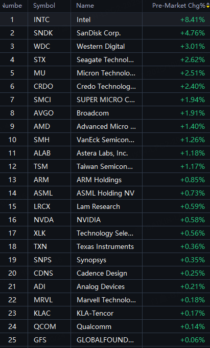 Chip And Storage Stocks Kept Rally. Intel Up 8%; SanDisk Up 5%; Western Digital Up 3%; Seagate, Micron, SMCI, Broadcom And Credo Up 2%.