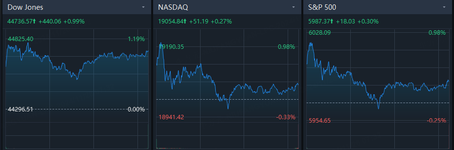 According to preliminary data, the S&P 500 gained 17.81 points, or 0.30%, to end at 5,987.15 points, while the Nasdaq Composite gained 51.50 points, or 0.27%, to 19,055.15. The Dow Jones Industrial Average rose 439.02 points, or 0.99%, to 44,735.53.
