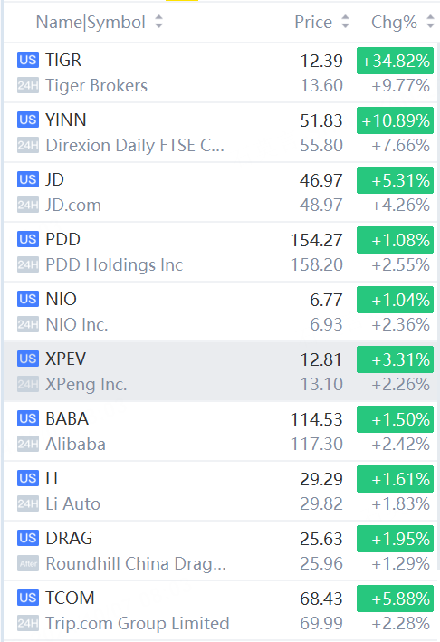 Tiger Brokers soared 9.8%; YINN jumped over 7%; JD.com gained 4%; PDD Holdings, XPeng, NIO, Alibaba rose over 2%.