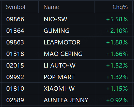 Some companies rose against the trend in Hong Kong. NIO rose 6%; Guming, Leapmotor, Mao Geping, and Li Auto rose 2%; Pop Mart and Xiaomi rose 1%.
