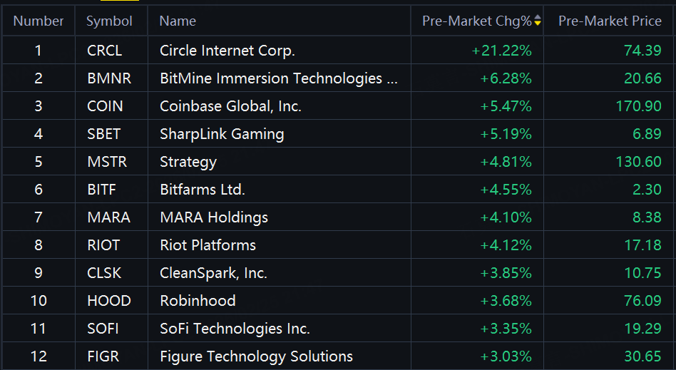 Crypto shares continued to jump in premarket trading. Circle up over 21%; BitMine up over 6%; Coinbase, SharpLink Gaming, Strategy up around 5%.