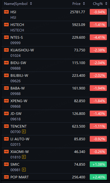 In terms of star stocks, NetEase fell 4%; Alibaba, Kuaishou, XPeng fell 2%; Tencent, Li Auto fell 1%; Xiaomi fell 0.3%; Pop Mart rose 2%.
