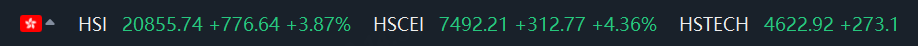 The Hang Seng Index rose nearly 4%, while the Hang Seng Tech Index rose 6.2%.