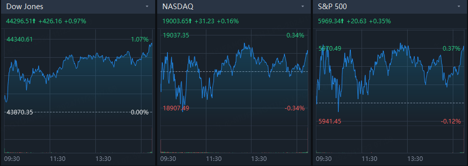 The Dow Jones Industrial Average gained 1% to set a new closing high, the S&P 500 rose 0.4% to finish higher for the fifth straight day and the Nasdaq Composite added 0.2%. Tesla rose 4%.