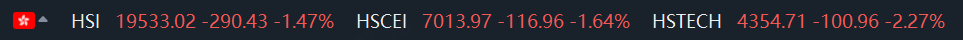 The Hang Seng Index fell 1.5% to 19,533.02 in afternoon trading, heading for the lowest close since September 25 in a five-day streak of declines. The Hang Seng Tech Index dropped 2.3%.