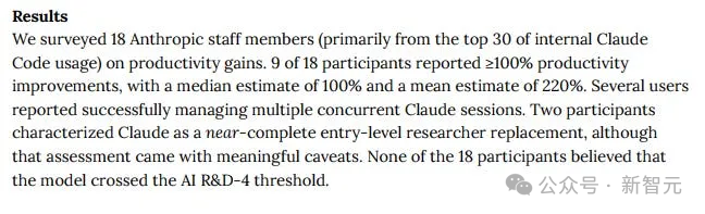 Anthropic的内部调查显示,其Opus 4.5模型已被部分员工视为「近乎完整的入门级研究员替代品」。