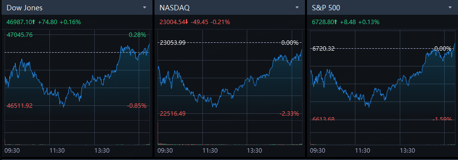 The Dow Jones Industrial Average rose 74.80 points, or 0.16%, to 46,987.10, the S&P 500 gained 8.48 points, or 0.13%, to 6,728.80 and the Nasdaq Composite lost 49.45 points, or 0.21%, to 23,004.54. SanDisk Corp. rose 15%, MP Materials Corp. rose 13%, Strategy and Robinhood rose 2%. XPeng Inc. fell 6%.