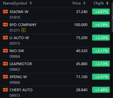 EV stocks rose in Hong Kong. Xiaomi up 5%; BYD up 4%; Li Auto, Nio, Leapmotor, XPeng up 3%.