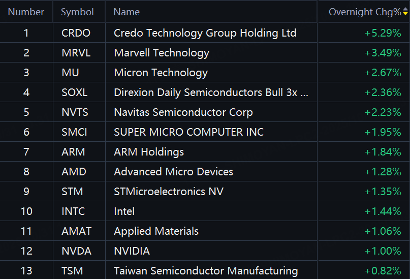 Chip stocks jumped in overnight trading. Credo up over 5%; Marvell up over 3%; Micron, SOXL, Navitas, SMCI up around 2%; Nvidia, ARM, AMD up over 1%.