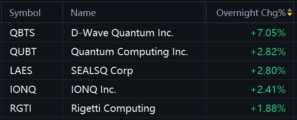 Some Quantum computing stocks jumped agian in overnight trading although Trump official said no talks over equity stakes. D-Wave Quantum rose 7%; Quantum Computing and Sealsq rose 3%; IonQ and Rigetti Computing rose 2%.