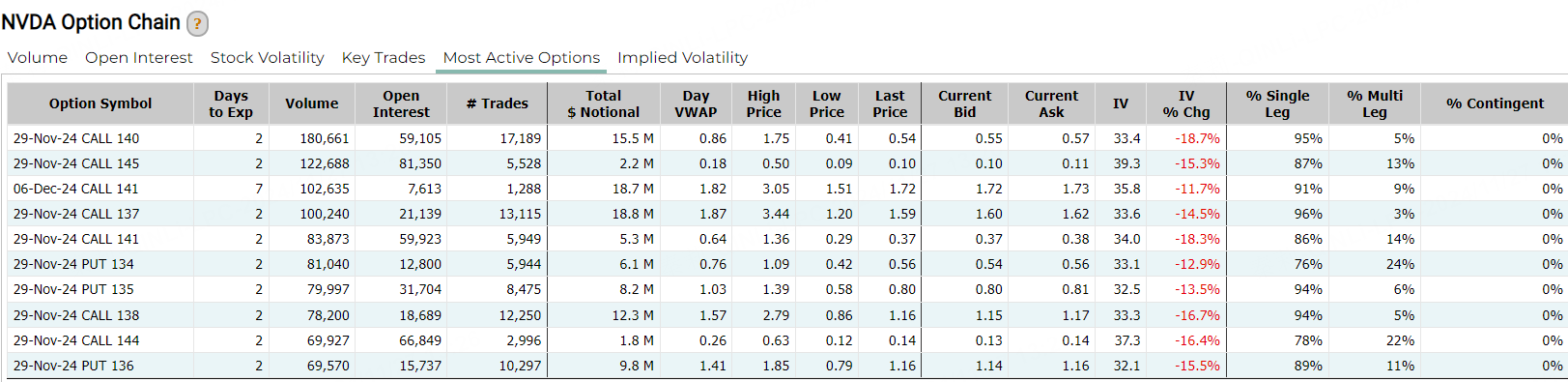 期权方面,英伟达当日期权成交336.73万张合约,看涨期权占比为66.5%,其中于11月29日到期的140美元行使价的看涨期权成交居前,成交18万张。