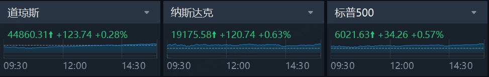 周二(11月26日)美股三大指数齐涨。标普500指数收涨34.26点,涨幅0.57%,报6021.63点。道指收涨123.74点,涨幅0.28%,报44860.31点。纳指收涨120.74点,涨幅0.63%,报19175.58点。