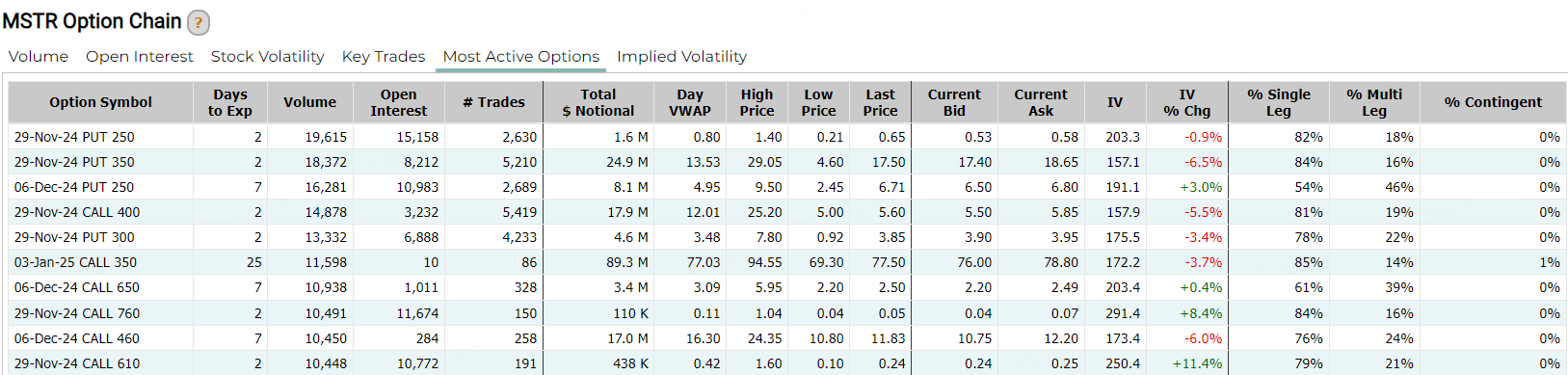 期权方面,MSTR成交约71.5万张合约,看涨期权占比53.6%,较前一交易日(63%)大幅下降。其中于11月29到期的250美元行使价的看跌期权成交居前,成交逾1.9万张。