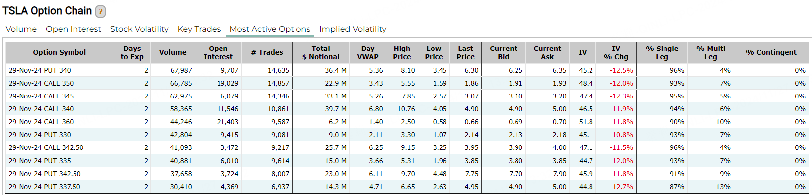 期权方面,特斯拉当日期权成交167.10万张合约,看涨期权占比为61.6%,其中于11月29日到期的340美元行使价的看跌期权成交居前,成交约6.8万张。