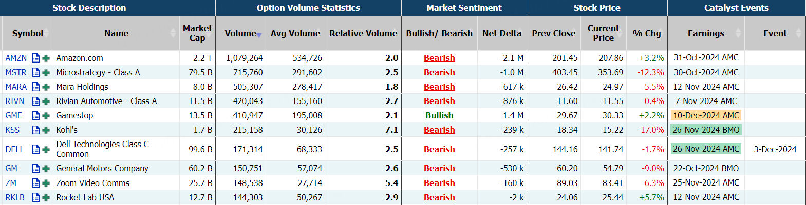周二,期权市场总成交量达4202万合约,低于每日平均期权交易量(4459万张),其中看涨期权占比59%;亚马逊成交约108.20万张合约,看涨期权占比79.1%;MSTR成交约71.5万张合约,看涨期权占比53.6%,较前一交易日(63%)大幅下降。