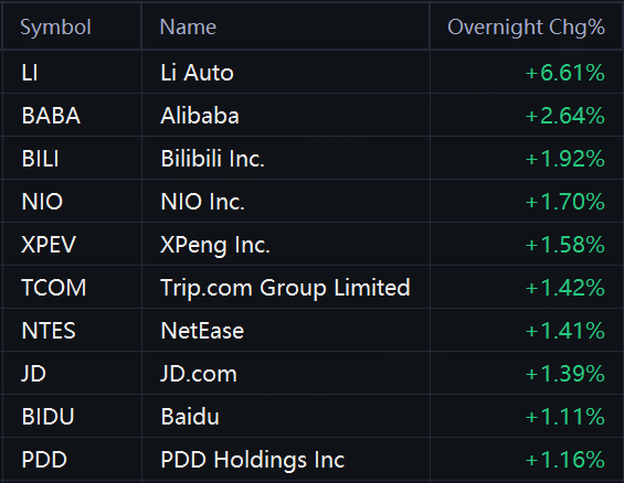 Some Chinese ADRs jumped in overnight trading. Li Auto rose 7%; Alibaba rose 3%; Bilibili, NIO, and XPeng rose 2%; Trip.com, NetEase, JD.com, Baidu, and PDD Holdings rose 1%.