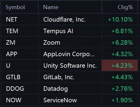 Software stocks jumped in morning trading. Cloudflare rose 10%; Tempus AI rose 7%; Zoom rose 6%; GitLab, AppLovin, and Unity rose 4%; Datadog rose 3%; ServiceNow rose 2%.