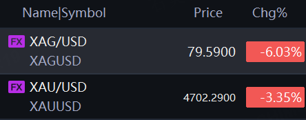 Spot gold slid 3.35% to $4,702 per ounce; Spot silver dropped 6% to $79.59 per ounce, having recorded its biggest ever intraday decline in the previous session.