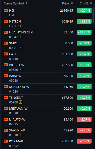 In terms of star stocks, Hua Hong Semi up 14%; SMIC up 8%; CATL, Bilibili up 3%; Alibaba, Kuaishou rose 2%; Meituan, Tencent rose 1%; Li Auto, Xiaomi fell 2%.